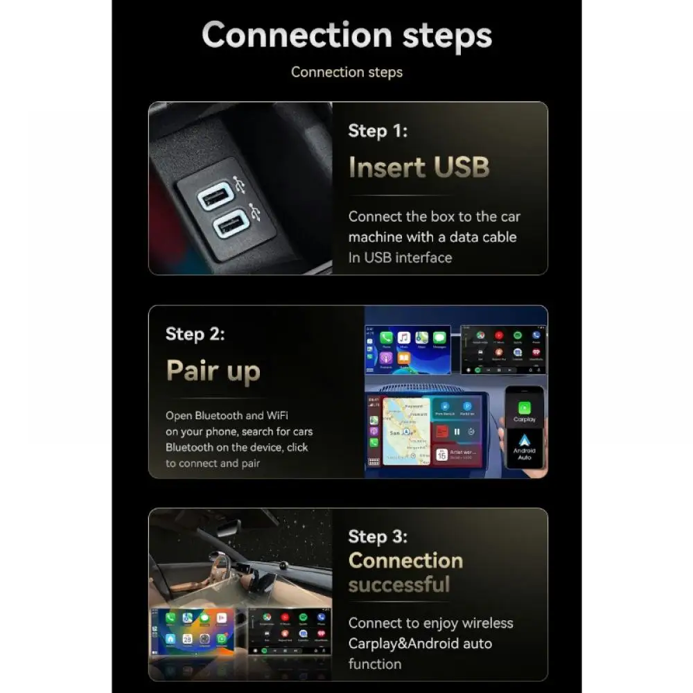 2. Effortless Plug-and-Play: Enjoy a hassle-free installation with the USB plug-and-play feature, providing stable and fast connectivity without the need to dismantle your OEM radio. Simply plug the AI smart box into your car's USB port, and you're ready to go. This straightforward setup ensures you can quickly enjoy wireless connectivity without any technical difficulties or modifications to your vehicle.